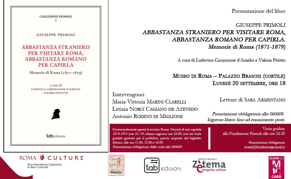 Nell’ambito della mostra “Roma. Nascita di una capitale 1870 -1915”, il Museo di Roma, nel cortile di Palazzo Braschi, ospiterà la presentazione del volume Abbastanza straniero per visitare Roma, abbastanza romano per capirla. Memorie di Roma (1871-1879), di Giuseppe Primoli, a cura di Ludovica Cirrincione d’Amelio e Valeria Petitto.