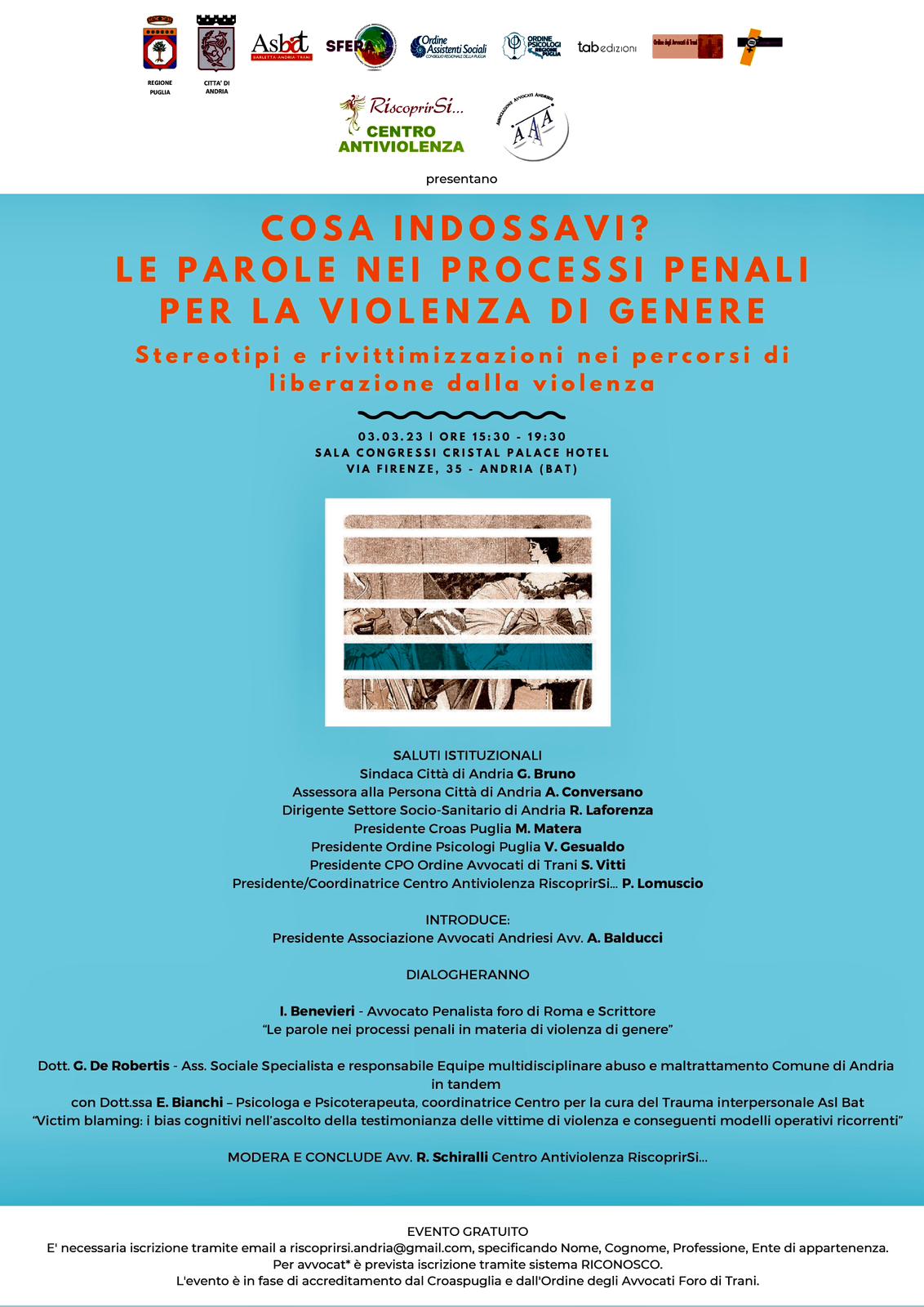 Nell'ambito di un importante convegno sugli stereotipi e rivittimizzazioni nei percorsi di liberazione dalla violenza, organizzato dal Centro antiviolenza RiscoprirSì… di Andria, Iacopo Benevieri presenta il suo libro Cosa indossavi? Le parole nei processi penali per violenza di genere in dialogo con professionisti del settore e rappresentanti delle istituzioni.