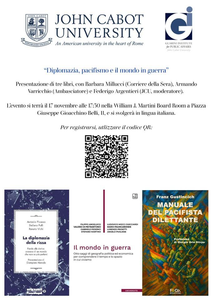 La John Cabot University ha organizzato un momento di confonto dal titolo Diplomazia, pacifismo e il mondo in guerra. Durante l'incontro è prevista la presentazione di tre libri: Il mondo in guerra (tab edizioni), La diplomazia della rissa (FrancoAngeli) e Manuale del pacifista dilettante (F&Co. edizioni).