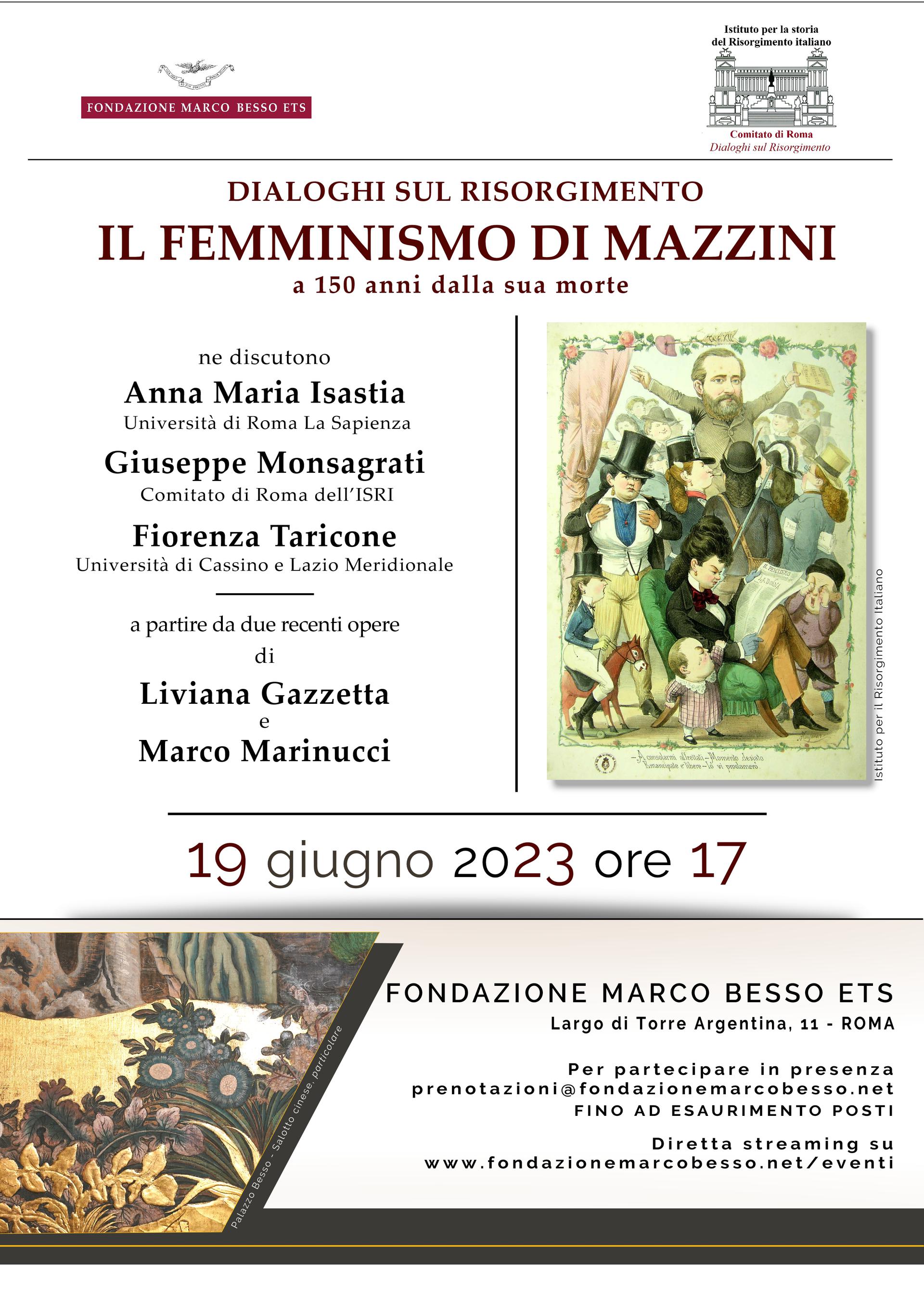 Anna Maria Isastia (Università di Roma La Sapienza), Giuseppe Monsagrati (ISRI) e Fiorenza Taricone (Università di Cassino e del Lazio meridionale) dialogano sul tema a partire dai volumi di Liviana Gazzetta (Femminismo mazziniano) e Marco Marinucci (Storia e storie del mazzinianesimo femminile). Saranno presenti i due autori.