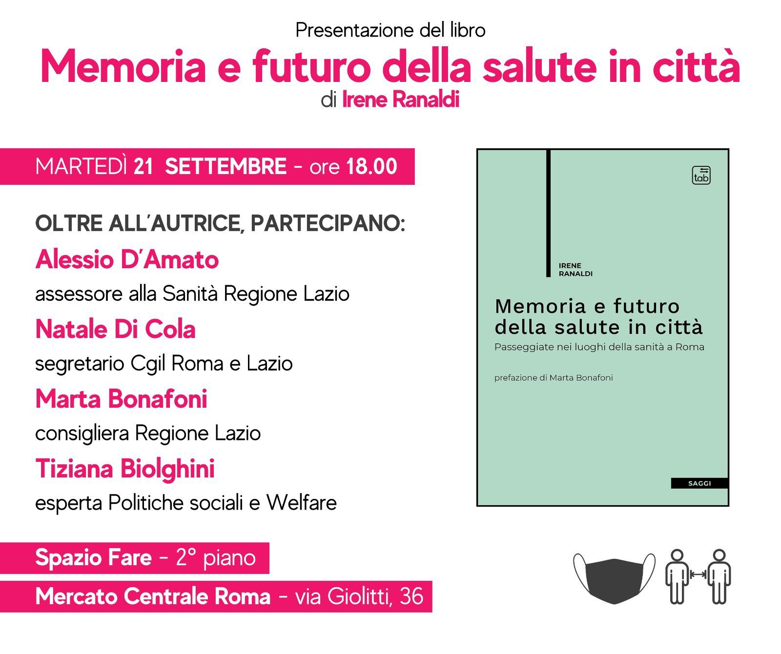 Presso lo Spazio Fare, al 2° piano del Mercato Centrale, si terrà la presentazione del libro di Irene Ranaldi. Insieme all'autrice interverranno Marta Bonafoni, consigliere regionale Lazio, Alessio D'Amato, assessore alla Sanità della Regione Lazio, Natale di Cola, segretario regionale Cgil, e Tiziana Biolghini, esperta di welfare e candidata al consiglio comunale di Roma.