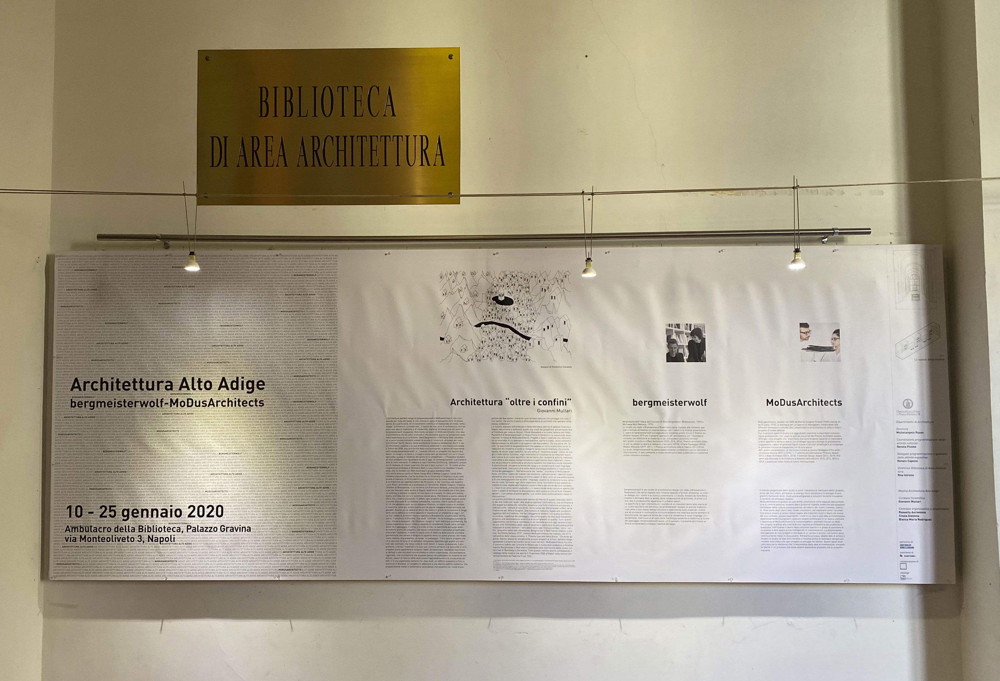 La mostra documenta le opere e il processo di formazione dei progetti di due studi di rilievo nel panorama internazionale: Bergmeisterwolf e MoDus Architects, entrambi con sede a Bressanone. Nel corso dell'inaugurazione, il 10 gennaio alle ore 15, sarà presentato anche il catalogo della mostra, edito da tab edizioni, con un saggio introduttivo del curatore, professor Giovanni Multari (DIARC).