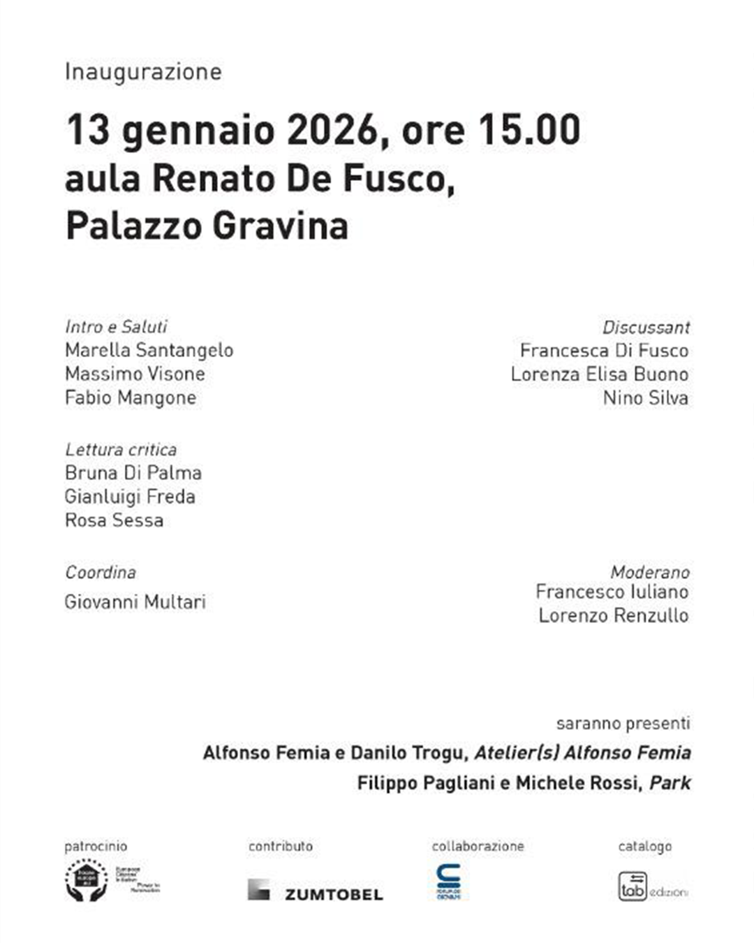 Nell’aula Renato De Fusco di Palazzo Gravina viene inaugurata la mostra Eredità in Architettura: Atelier(s) Alfonso Femia–Park. Sono presenti gli architetti Alfonso Femia e l’artista ceramista Danilo Trogu dell’Atelier(s) Alfonso Femia e gli architetti Filippo Pagliani e Michele Rossi dello studio Park.