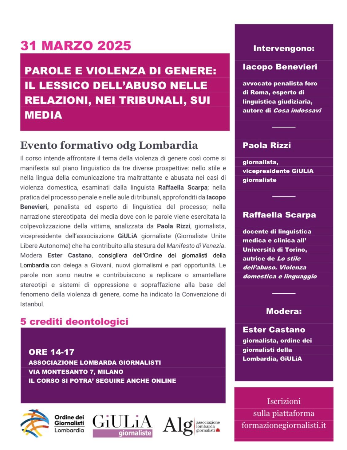 Intervengono anche Paola Rizzi, giornalista e vicepresidente di Giulia Giornaliste, e Raffaella Scarpa, docente di linguistica medica e clinica all'Università di Torino e autrice di Lo stile dell'abuso. Violenza domestica e linguaggio. Modera l'incontro la giornalista Ester Castano.