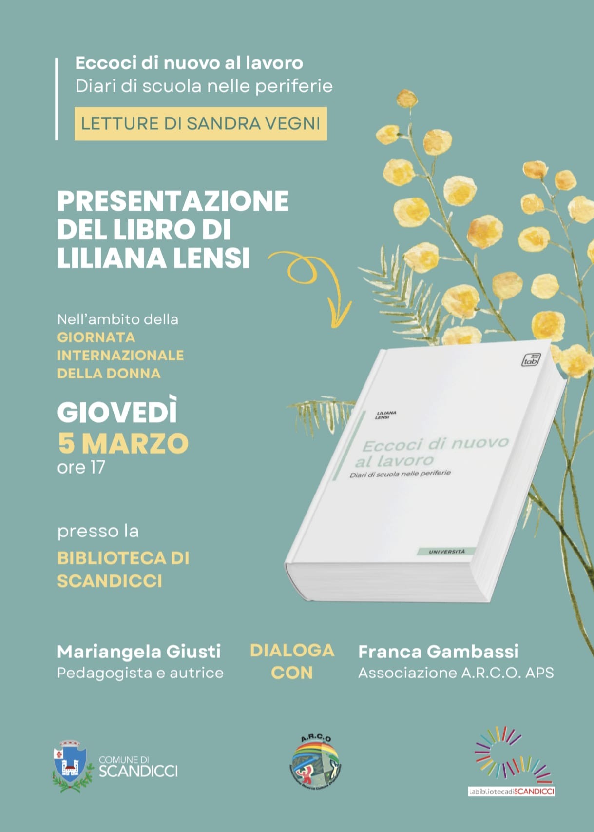 In occasione della Giornata internazionale della donna, viene presentato il libro Eccoci di nuovo al lavoro. Mariangela Giusti, pedagogista e autrice, dialoga con Francesca Gambassi, dellassociazione A.R.C.O APS.