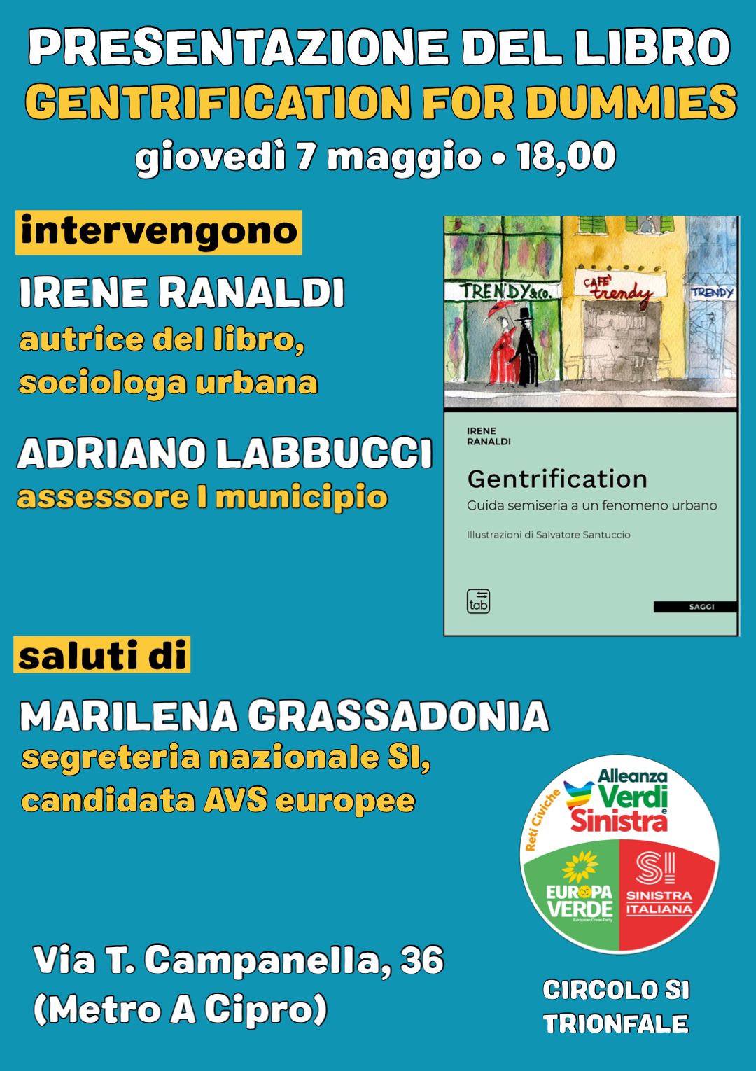 Irene Ranaldi, sociologa urbana, presenta il suo libro Gentrification. Guida semiseria a un fenomeno urbano al Circolo Trionfale di Alleanza Verdi e Sinistra. Con l'autrice interviene Adriano Labbucci, assessore del I municipio.