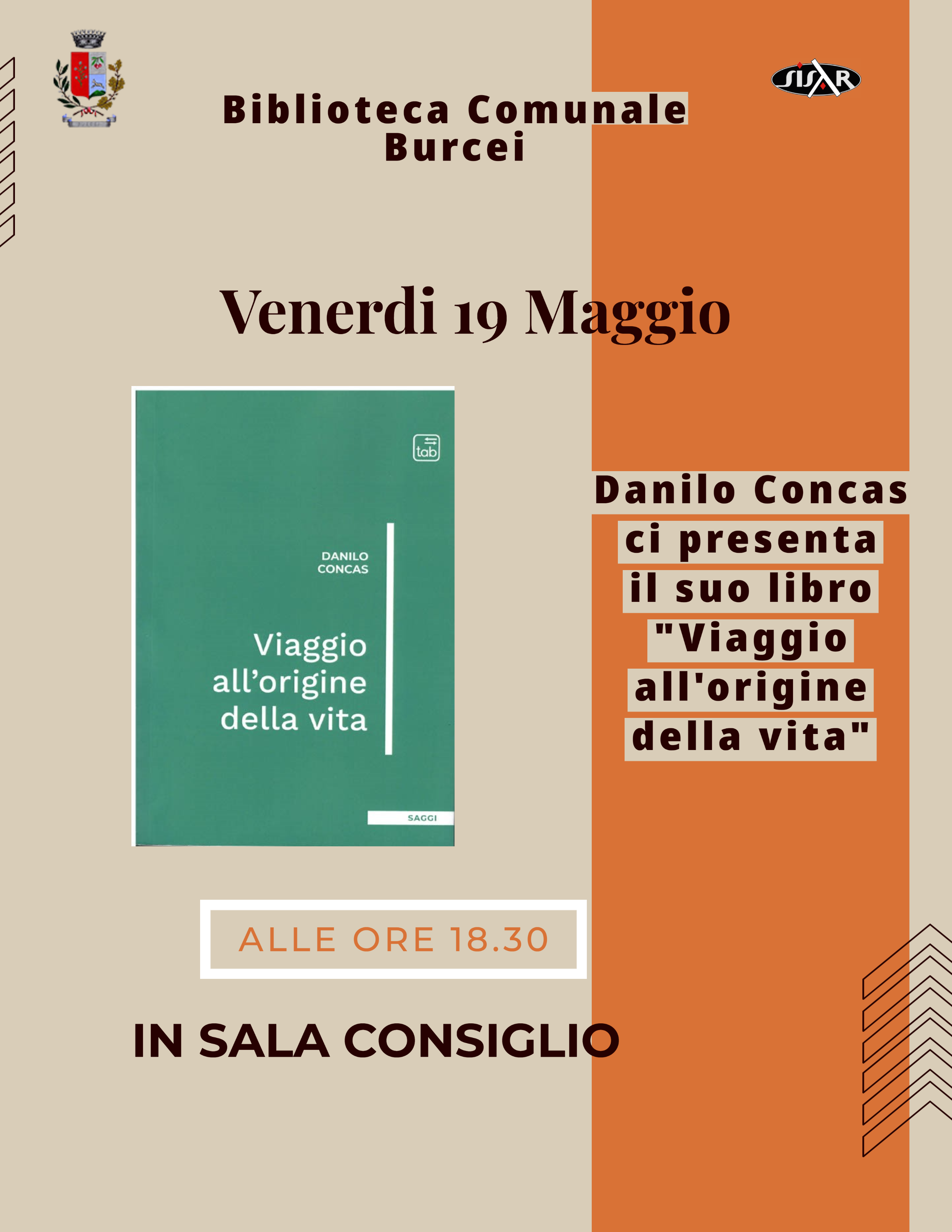 Danilo Concas presenta il suo libro Viaggio all'origine della vita presso la Sala Consiglio della Biblioteca Comunale di Burcei.