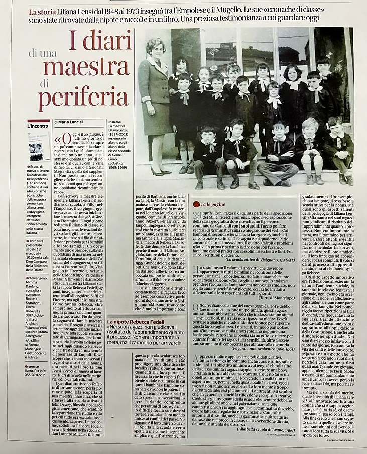 Il libro contiene i Diari e le Cronache scolastiche di Liliana Lensi, maestra elementare, pedagogista, interprete attiva del rinnovamento della scuola italiana, da lei intesa come luogo che educa ai valori della democrazia. In queste importanti pagine, la Maestra racconta il suo lavoro nelle classi dal 1948 al 1973, nelle scuole di Ginestra Fiorentina, Pillo di Gambassi, Visignano di Firenzuola, Torre di Montelupo, Pagnana e Avane di Empoli. La seconda parte del volume offre invece riflessioni su temi attuali tratti dai Diari stessi. Una lettura avvincente, ricca di spunti, utile alla formazione degli insegnanti, a chi si occupa di scuola, a genitori e amministratori pubblici.